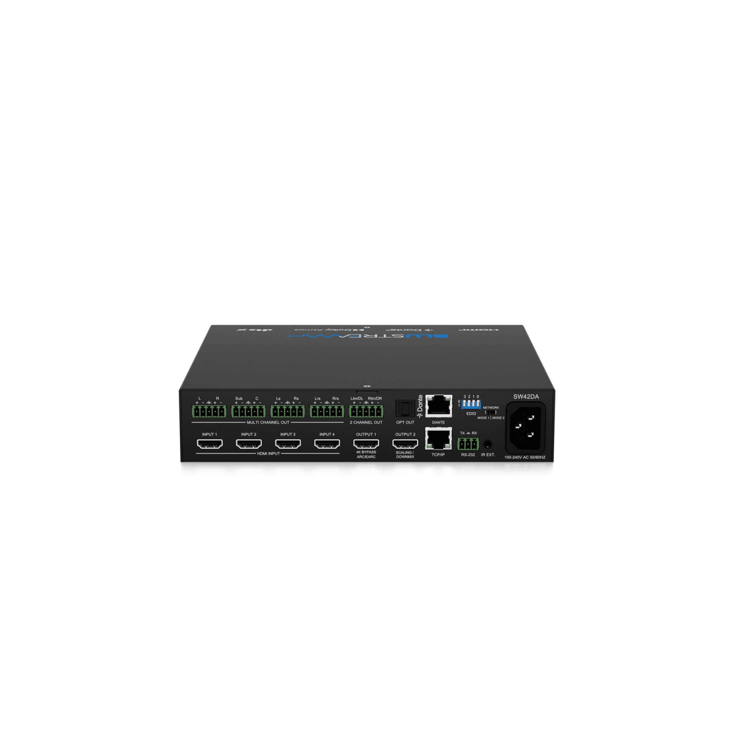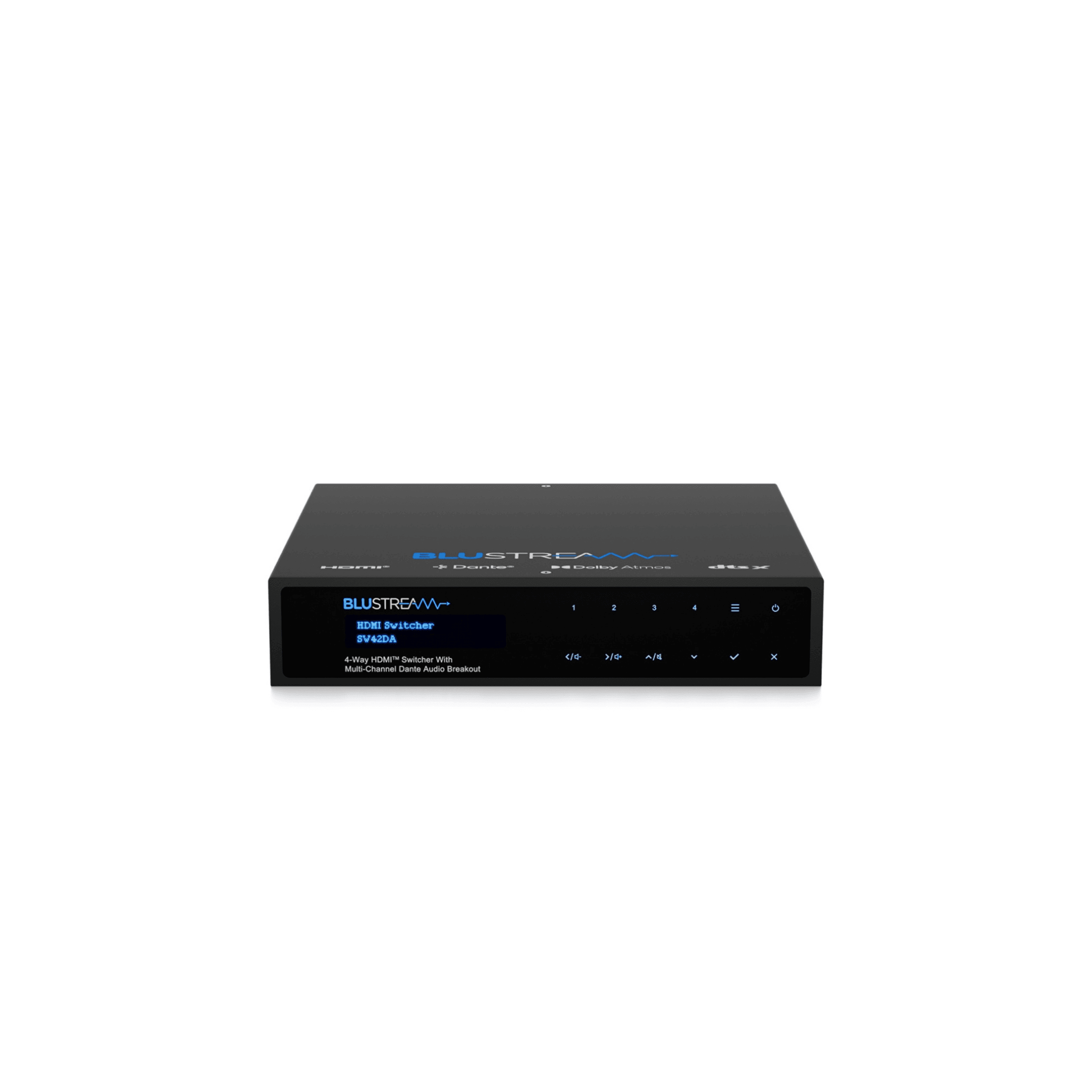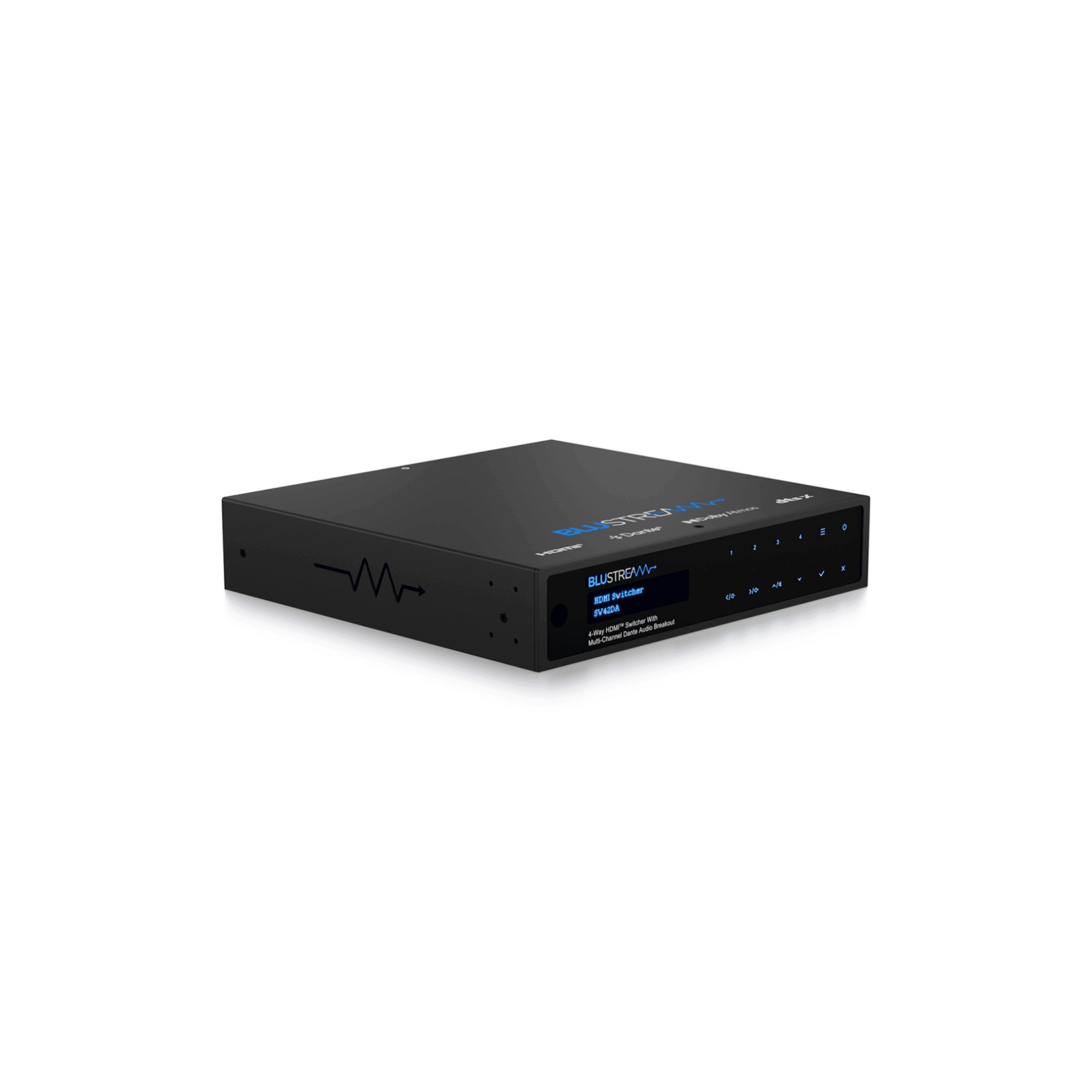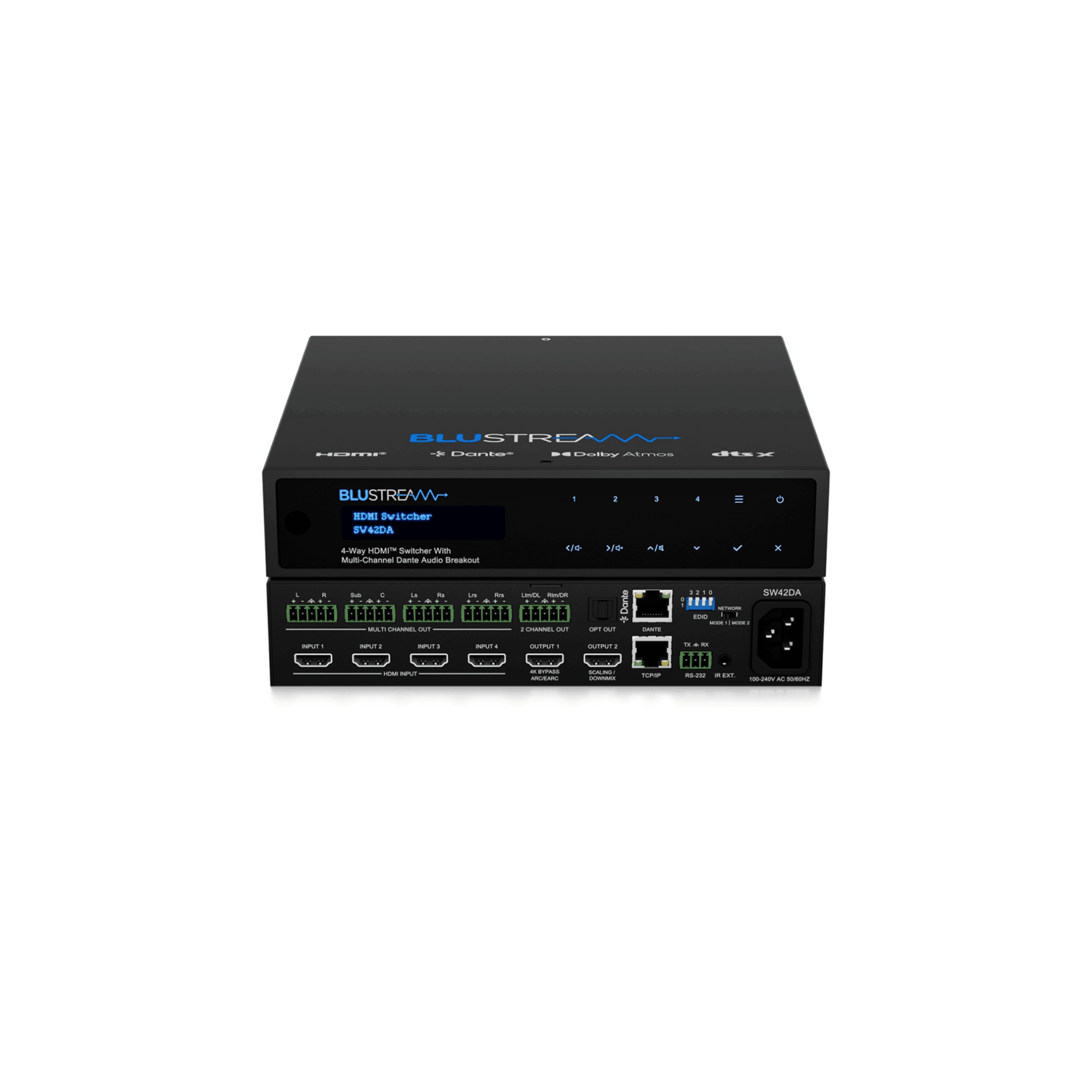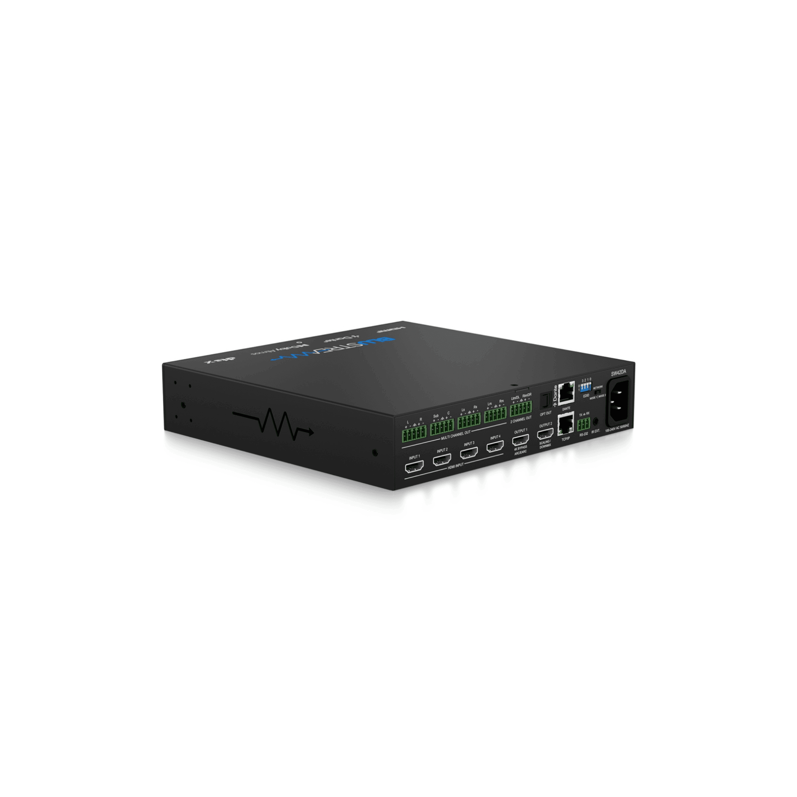 4-Way HDMI Switcher with Dual HDMI Output, Multi-Channel Dante Audio Breakout, Downmixed 2ch Dante Audio Breakout, Multi-Channel Balanced/Unbalanced Audio Breakout, Downmixed 2ch Balanced/Unbalanced Audio Breakout, Web-GUI, TCP/IP, IR, RS-232, & CEC Control
