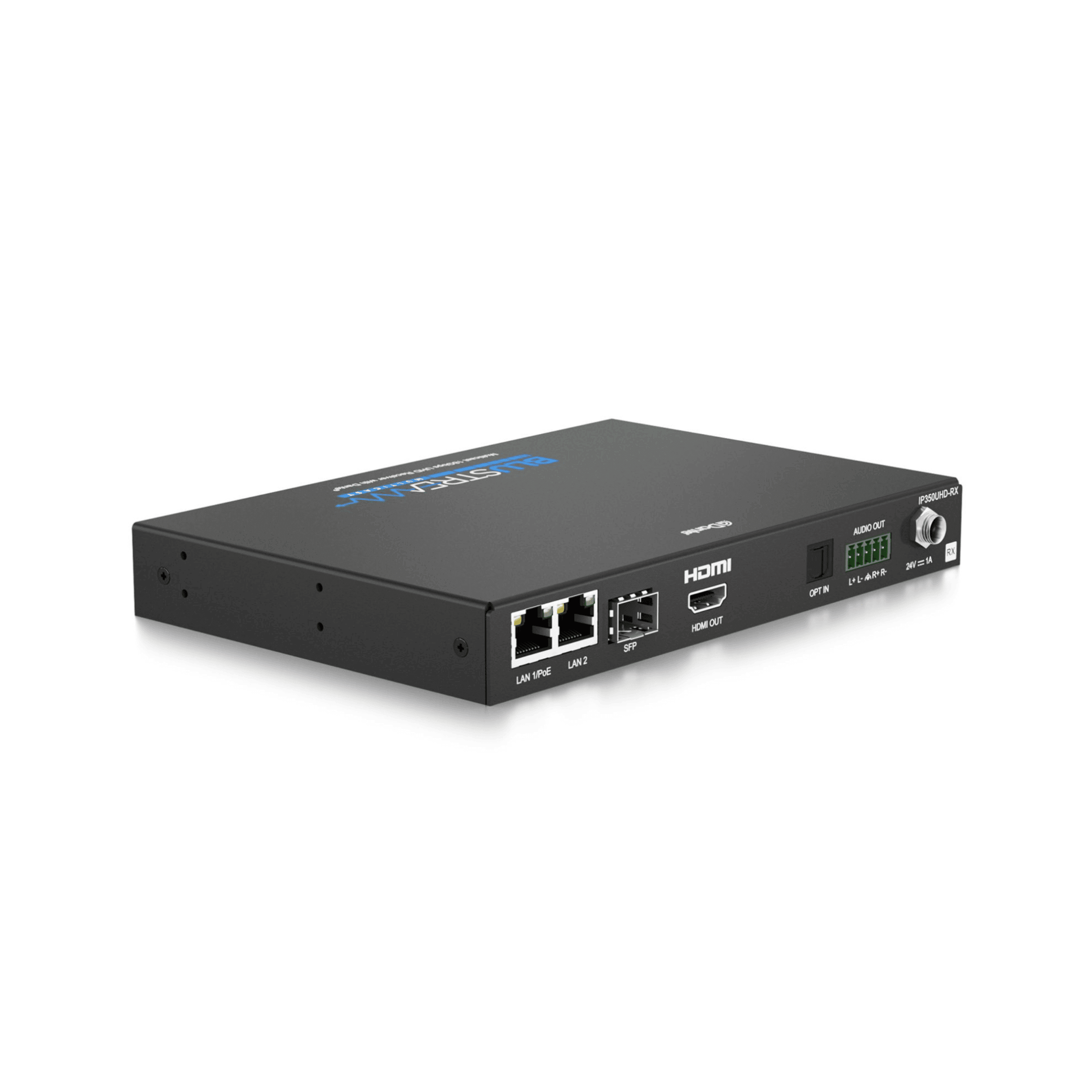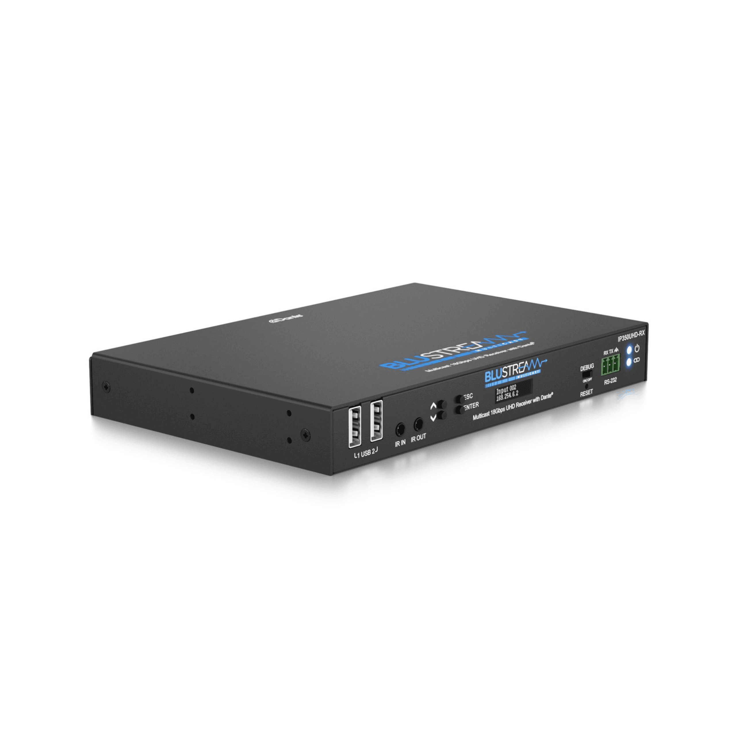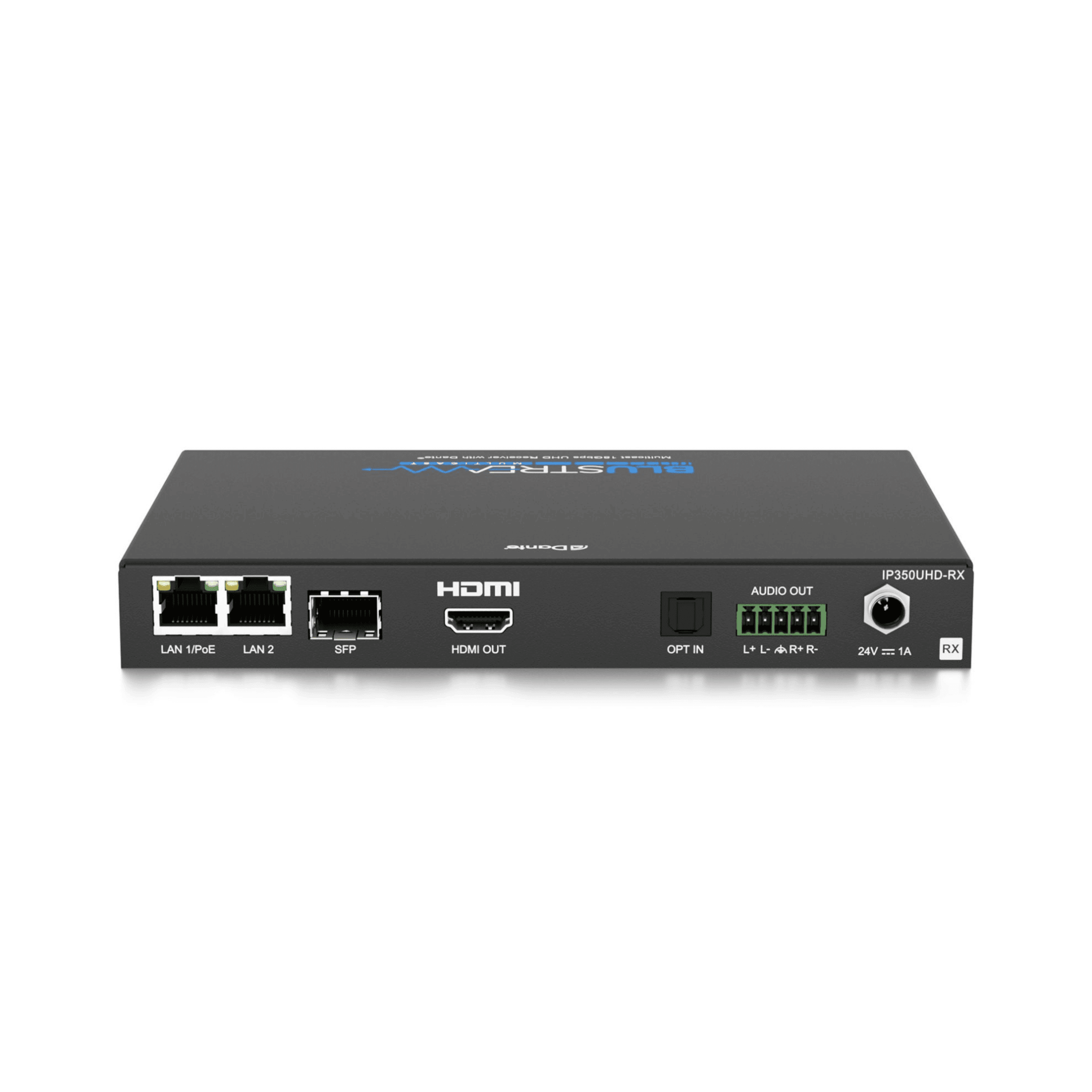 18Gbps UHD Video Receiver over 1Gb Network, Built-in Video Scaler, Video-wall mode, 2ch Dante Audio Transmitter/Receiver, Dual RJ45 & SFP Network Ports, Bi-directional IR, RS-232 & USB/KVM, PoE, Analogue Audio Breakout and HDCP 2.2