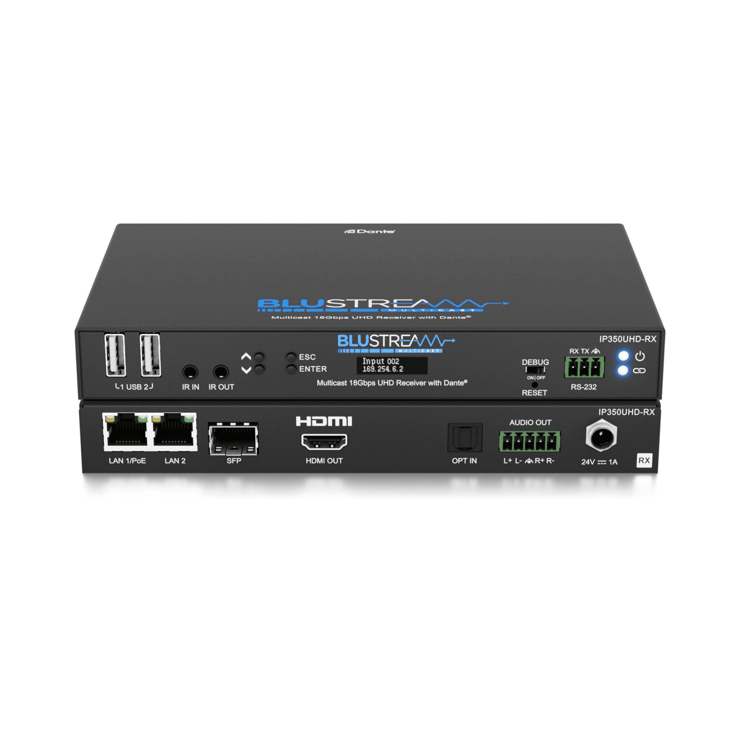 The Blustream IP300UHD series video over IP distribution platform enables virtually latency free one frame distribution of 4K 18Gbps HDMI video over a 1Gb managed network. Fully interoperable with the IP300UHD product line, the IP350UHD-RX is a Dante enabled 4K HDMI receiver that uses visually lossless compression to deliver 18Gbps HDMI, ARC eARC and optical audio return, embedded audio, Dante and AES67 audio, along with bi directional IR, RS 232 and USB KVM over distances of up to 100 metres on standard copper networks or over longer distances via the integrated fibre SFP interface. The IP350UHD-RX supports both video and Dante audio distribution on a single network, with a second RJ45 port allowing the Dante audio network to be separated from the video over IP network for larger or independently managed systems. Featuring a full 18Gbps HDMI scaling chipset, the HDMI output can be downscaled to support legacy displays within the same system as full 4K distribution, while also enabling video wall creation. Power can be supplied via PoE from a compatible network switch or locally if PoE is not available, and with multiple configuration options the flexibility of this video over IP platform makes it suitable for a wide range of commercial and residential installations.
