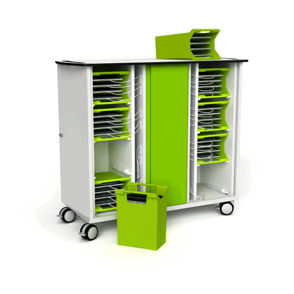 The iPad & tablet 32 bay USB-C basket charging trolley from Zioxi is a totally flexible basket trolley that allows you to store and charge up to 32 iPads or tablets simultaneously in one convenient unit. Featuring portable iPad carry baskets for simplified movability, each basket houses up to 4 iPads or tablets in any standard case design. When charging, baskets can be placed inside a safe and secure unit with short length USB-C cables presented to users for each tablet, keeping the basket charging trolley neat and tidy and the cables well out of the way.