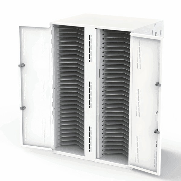 The Loxit iBank 60 UK Charging Cabinet provides secure storage for up to 60 iPads, iPad minis, and other tablets. Each compartment accommodates devices measuring up to 270mm in height (charging side), 300mm in depth, and cases up to 28mm in thickness. Constructed from robust steel and equipped with high-quality ASSA Abloy locks, this cabinet ensures a reliable and secure solution for device storage. The charging functionality is conveniently located at the rear within a separate lockable compartment, featuring charging strips that work with the tablets’ own transformers and cables. Designed for ease of access, the cabinet facilitates quick installation and efficient cable management.
