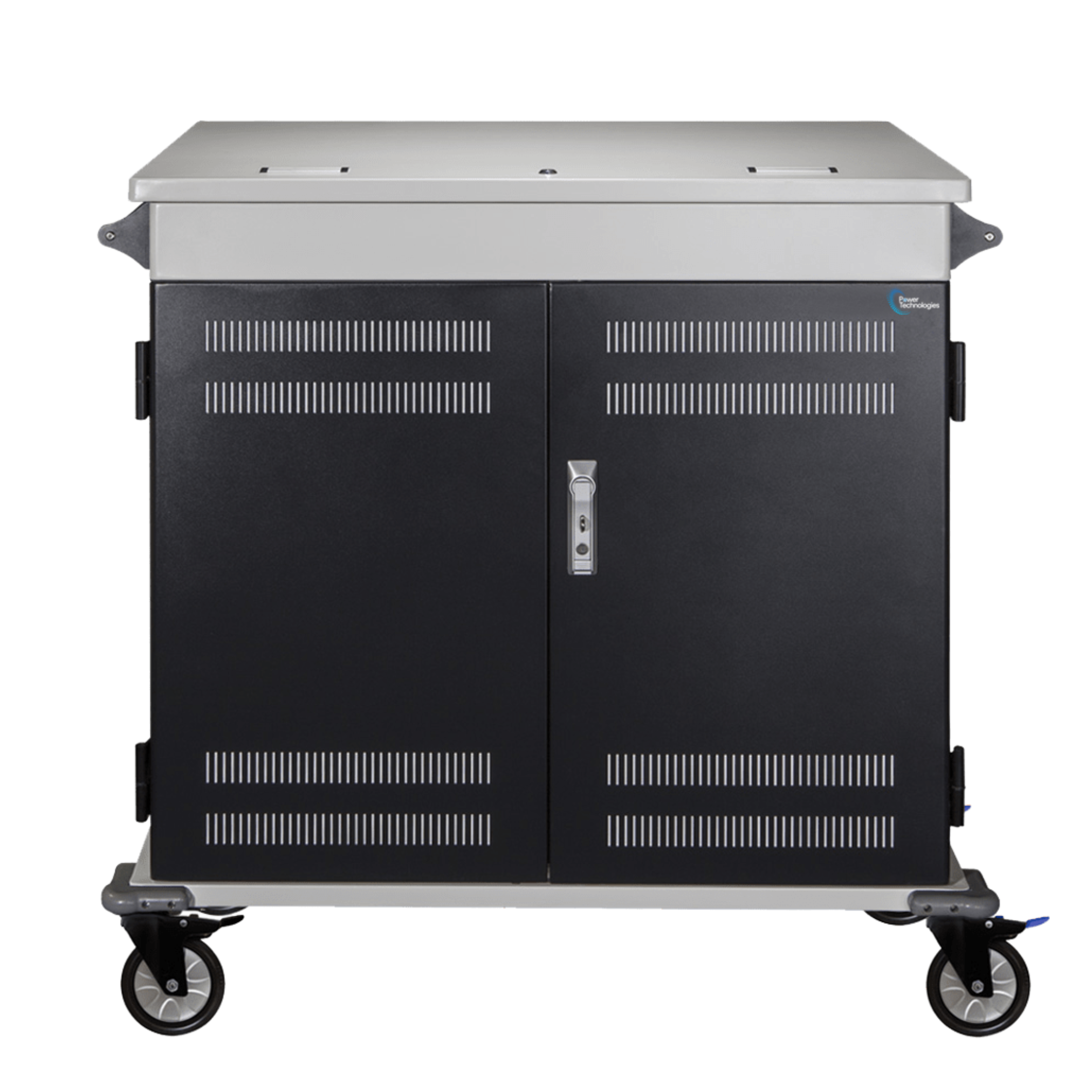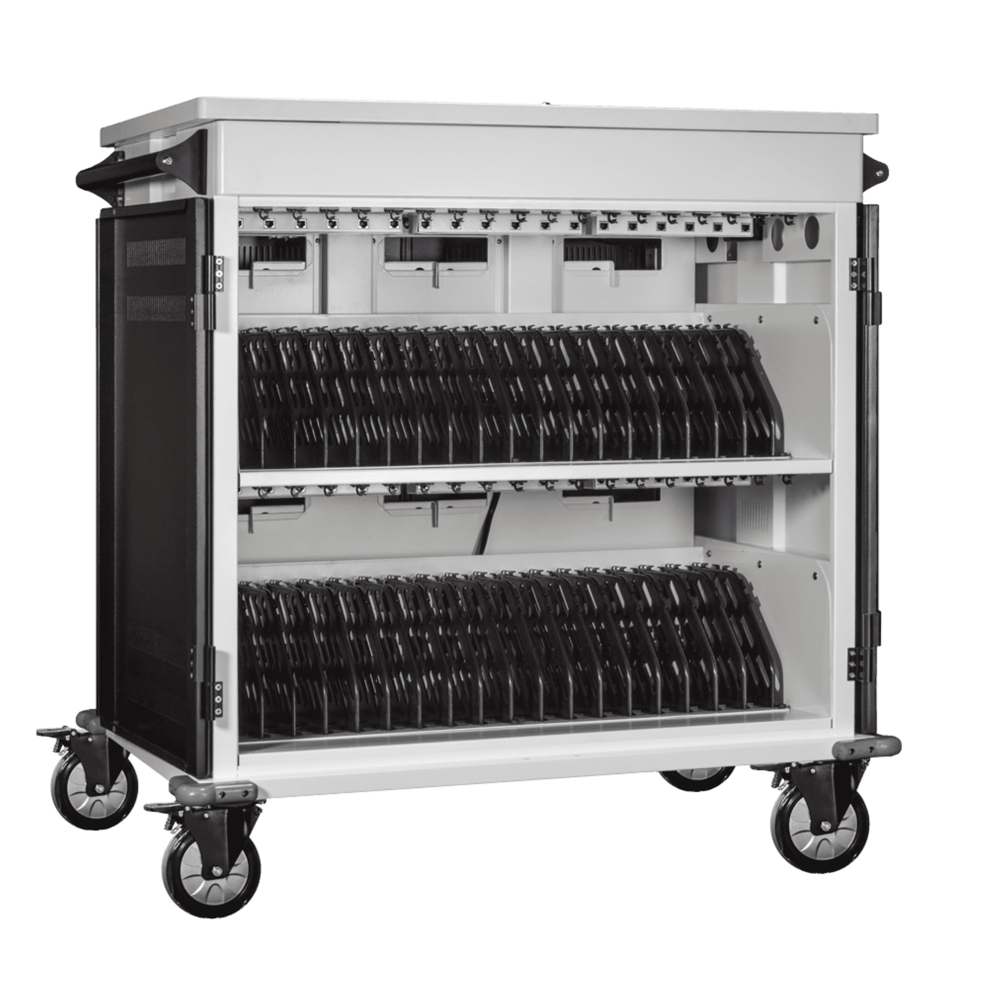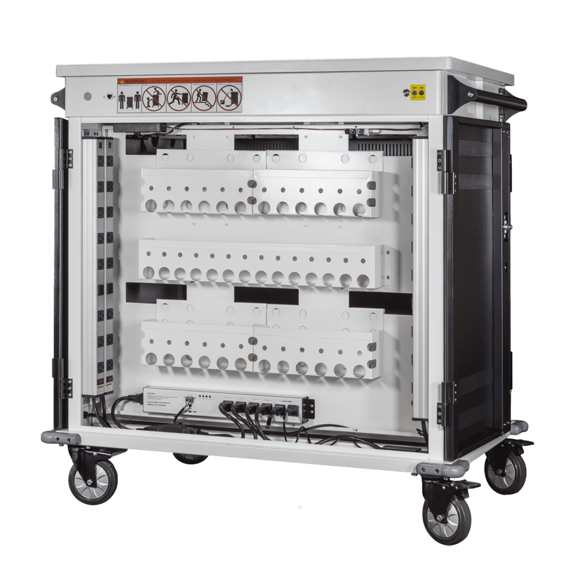 The Power Technologies Premium 36-Bay AC-MANAGE Secure Smart Charging Cart allows users to efficiently manage, charge, and store up to 36 devices up to 17” with its integrated LAN switch mount. Deploy updates seamlessly via Cat5 or Cat6 cabling. With a 3-Point Locking Door w/Padlock Loop, this 4 wheel cart allows max security and effective charging.