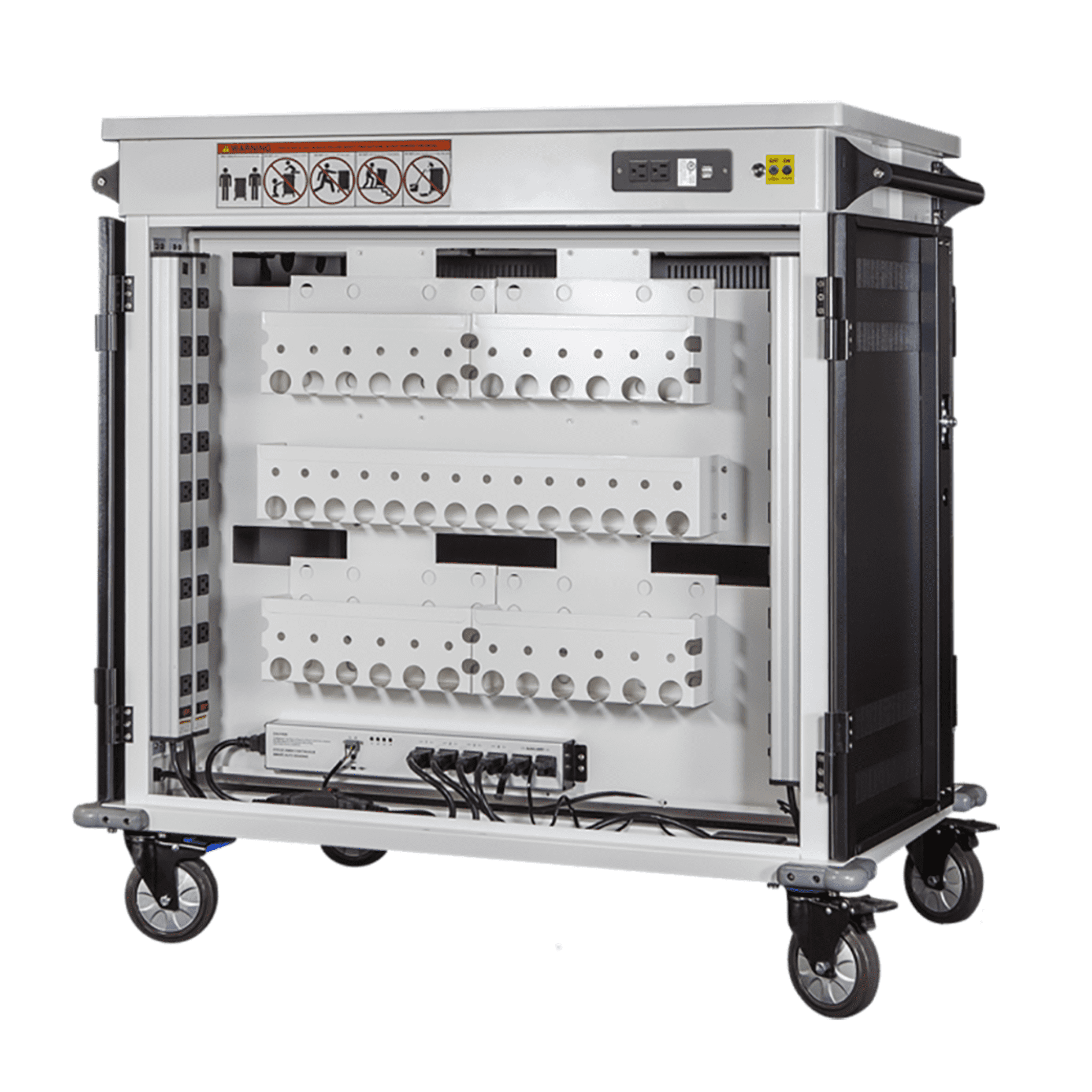 The Power Technologies Premium 40-Bay AC-PRO-II Secure Smart Charging Cart has 2 roll out shelves making access to devices quick and easy. With its powered and locking “Instructor’s Drawer”, it’s the perfect cart to store a test proctoring computer or other instructional items. This 4 wheel cart efficiently stores up to 40 devices from chromebooks to laptops to tablets, making it an ideal charging trolley cart solution.