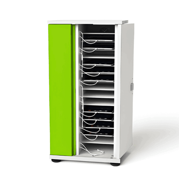 The Zioxi 16 Bay iPad & Tablet Freestanding Sync and Charge Cabinet is a sync and charge station that allows you to easily sync data to a host computer while simultaneously charging up to 16 devices. Featuring a large shelf size with short length cables presented at the front of the cabinet for easy accessibility, this charging solution keeps power supplies housed in a separate isolated compartment for unparalleled security. With magnetic doors that open out 270-degrees and a key powered locking mechanism, this cabinet was designed with the safety of your staff and students in mind.