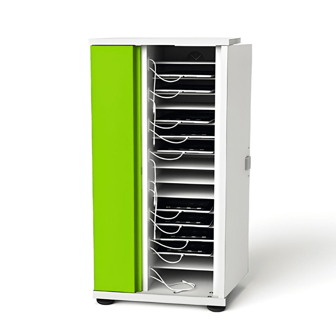 The Zioxi 20 Bay iPad & Tablet Floor Standing Charging Cabinet is a store and charge station for education that allows you to charge up to 20 iPads and tablet simultaneously. Featuring a large shelf size with short length cables presented at the front for easy accessibility, this charging solution keeps power supplies housed in a separate isolated compartment for unparalleled security. With magnetic doors that open out 270-degrees and a key powered locking mechanism, this cabinet was designed with the safety of your staff and students in mind.