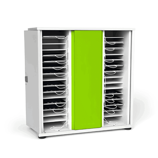 The Zioxi 32 Bay iPad & Tablet Floor Standing Charging Cabinet is a store and charge station for education that allows you to charge up to 32 iPads and tablet simultaneously. Featuring a large shelf size with short length cables presented at the front for easy accessibility, this charging solution keeps power supplies housed in a separate isolated compartment for unparalleled security. With magnetic doors that open out 270-degrees and a key powered locking mechanism, this cabinet was designed with the safety of your staff and students in mind.